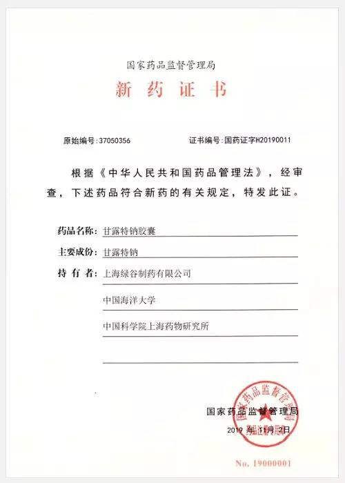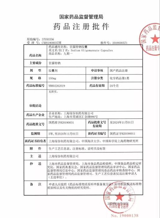 2019年11月2日,国家药品监督管理局批准了上海绿谷制药有限公司治疗阿尔茨海默病新药——九期一(甘露特钠,代号:GV-971)的上市申请。