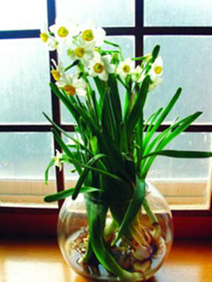 “借水开花自一奇,水沉为骨玉为肌。”时届花期,在花店或花鸟市场上得一雕刻好的水仙花头,置于浅盆清水,配以奇磊灵石,便能绽出冰肌玉质的花朵,作案头清供,几上雅陈,厅室点缀,其姿自然入妙,别有风光,细细品赏,情趣盎然,令人陶醉。(缪士毅 浙江省永嘉县委组织部)