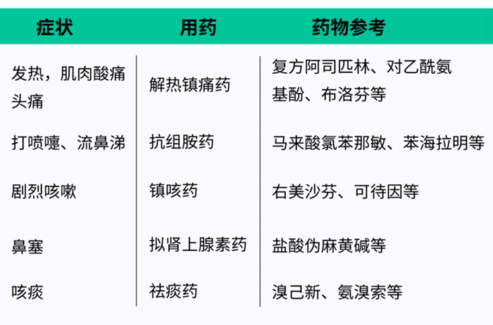 抗生素是细菌引起的感冒才用(咽痛超过3天考虑使用),一般的感冒都是病毒引起的。病毒引起的感冒症状,可以参考下面的用药: