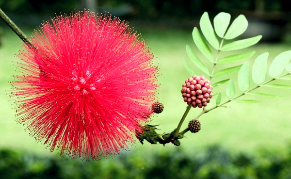 合欢花,一朵朵伞房似的头状花序,三个一丛,四个一团,聚在一起,粉红色绒毛状,不仅外形好看,还能吐露阵阵芬芳,轻柔飘逸。花冠形如狭长的漏斗,色泽淡红,而那长长的花蕊,色泽粉红,“散状如丝,为花之异”,羽状的复叶昼开夜合,十分神奇,甚为迷人。